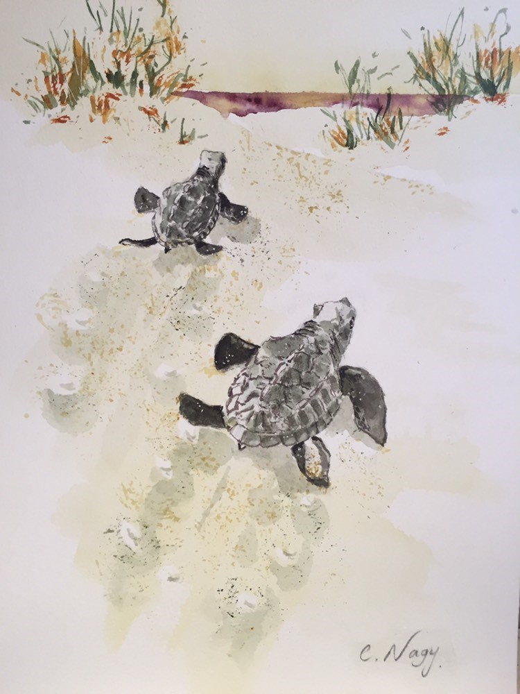 Carol Nagy- Hatchlings; two baby turtles heading for the ocean. We need every one of them to survive. Great environmental comment!