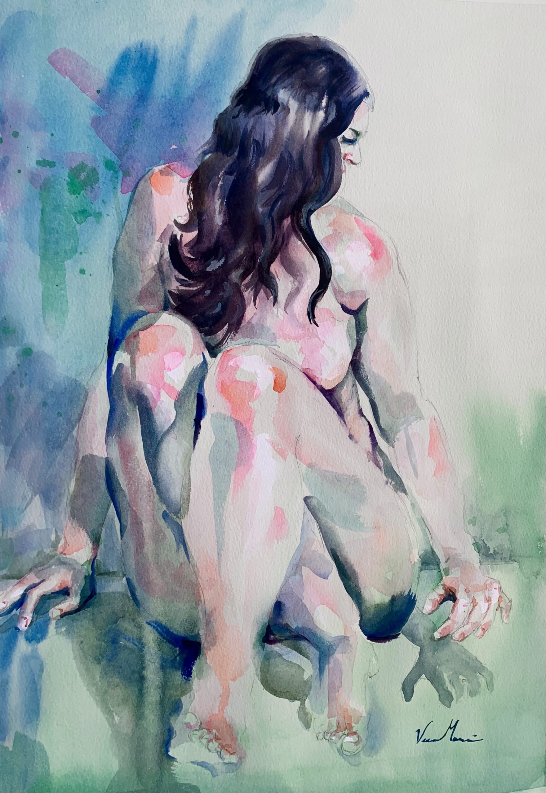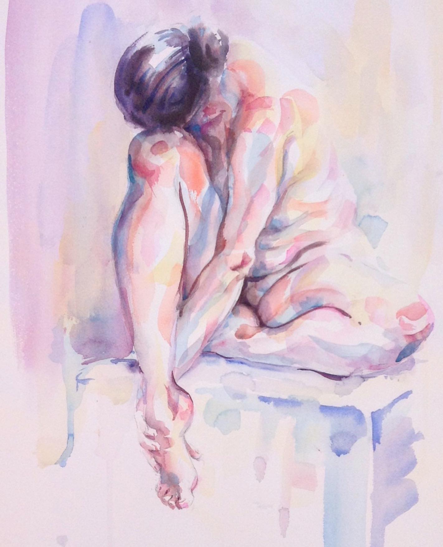 The women in the paintings in this exhibition are nude, but their nakedness is not simply a statement. It shows us they are the figures of living women in their self-reflective moments – feminine with sensitivity, strength, sensuality and with a capacity for complexity and confidence, in their closed poses.