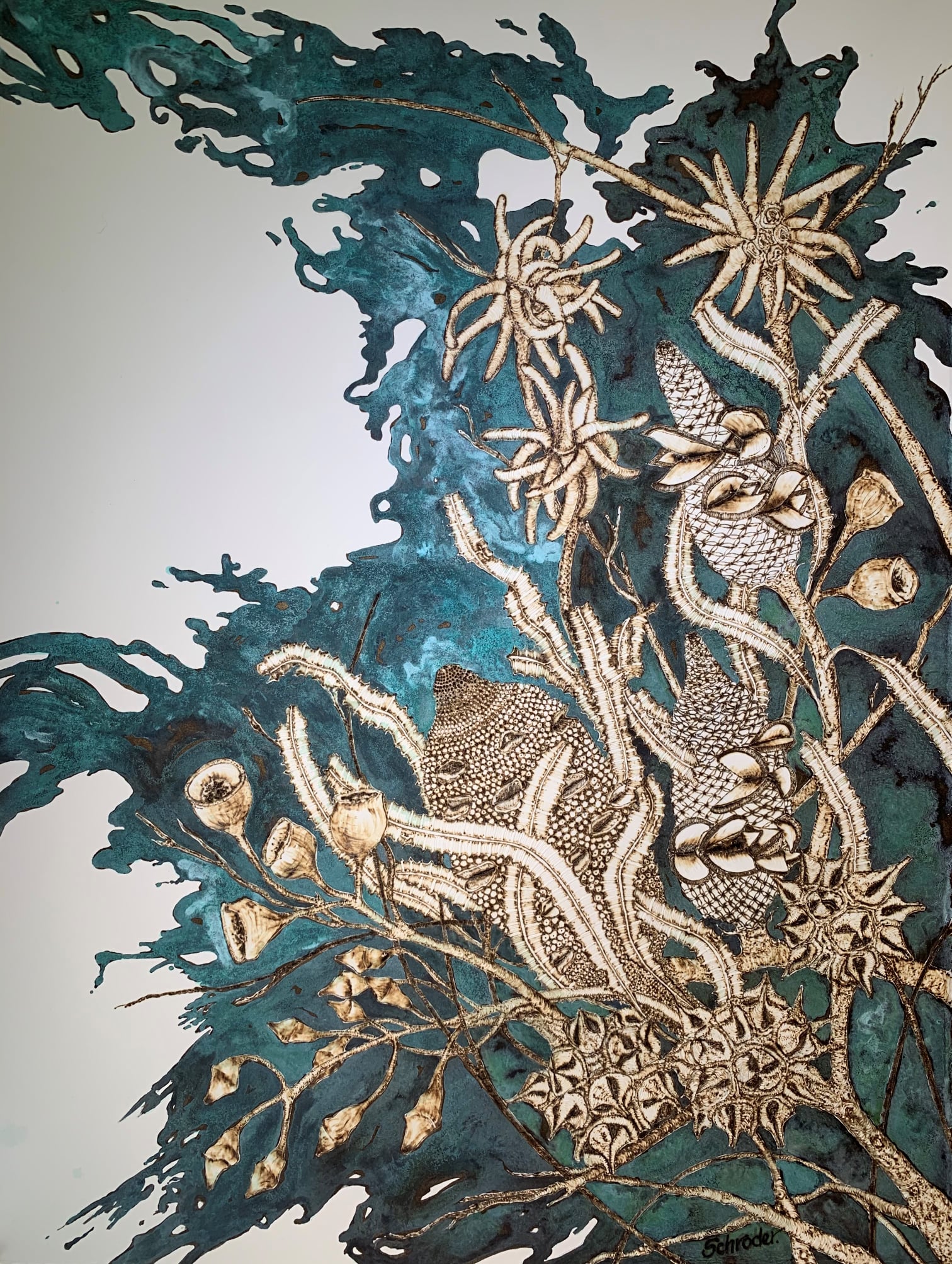 Schroder has created her current art work by burning directly into the archival paper. Some images also include watercolour so both the fire and water elements complement each other.