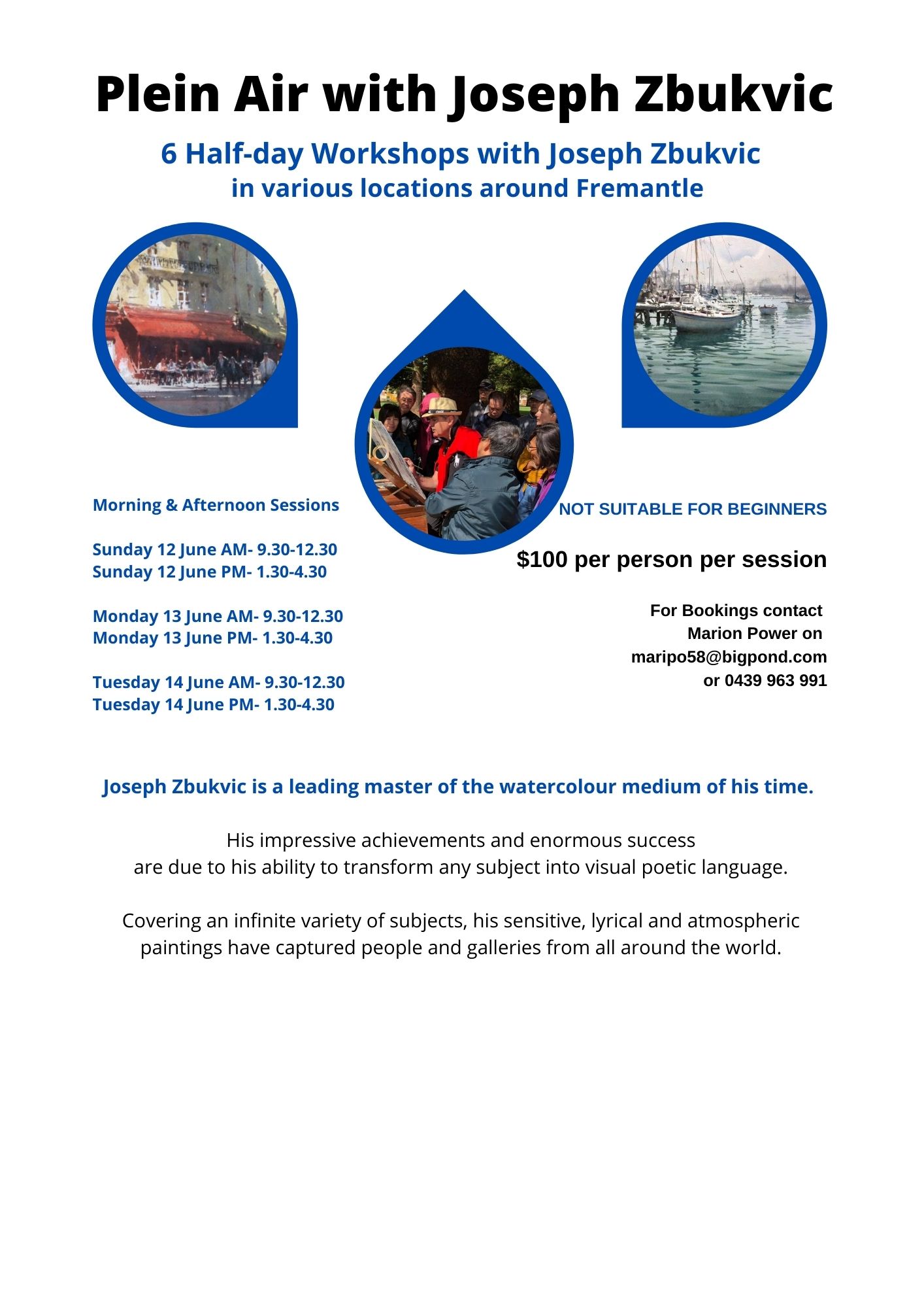 Joseph Zbukvic will be conducting 6 half day Plein Air Workshops on Sunday 12, Monday 13 & Tuesday 14 June, 2022 as part of the International Watercolour Exhibition Fremantle 2022. NOT SUITABLE FOR BEGINNERS.