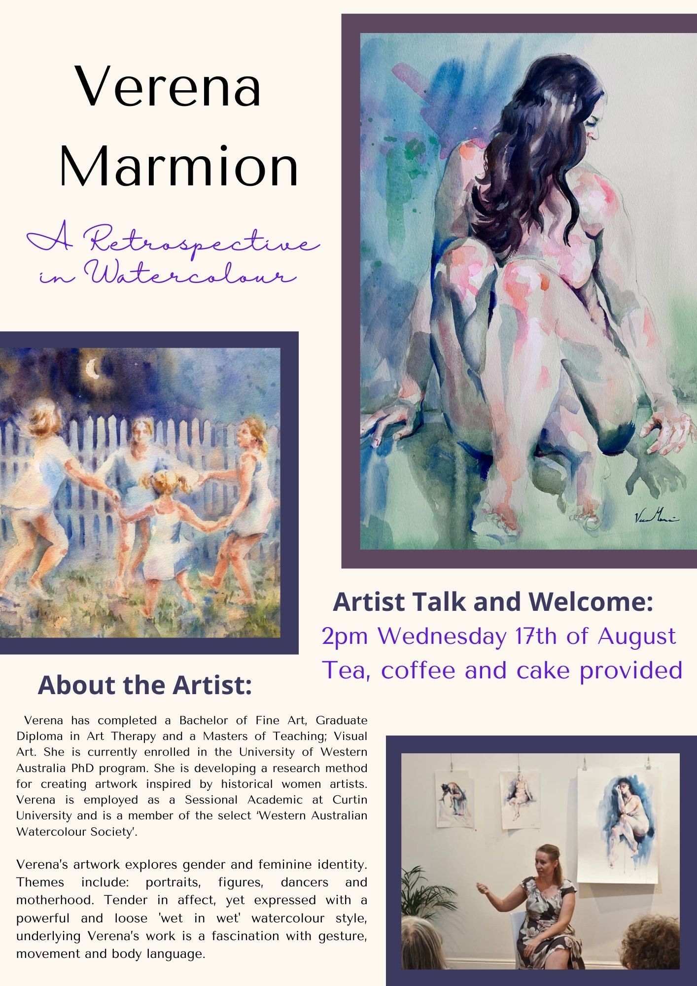 She is currently enrolled in the University of Western Australia PhD program. She is developing a research method for creating artwork inspired by historical women artists. Verena is employed as a Sessional Academic at Curtin University and is a member of the select ‘Western Australian Watercolour Society’.