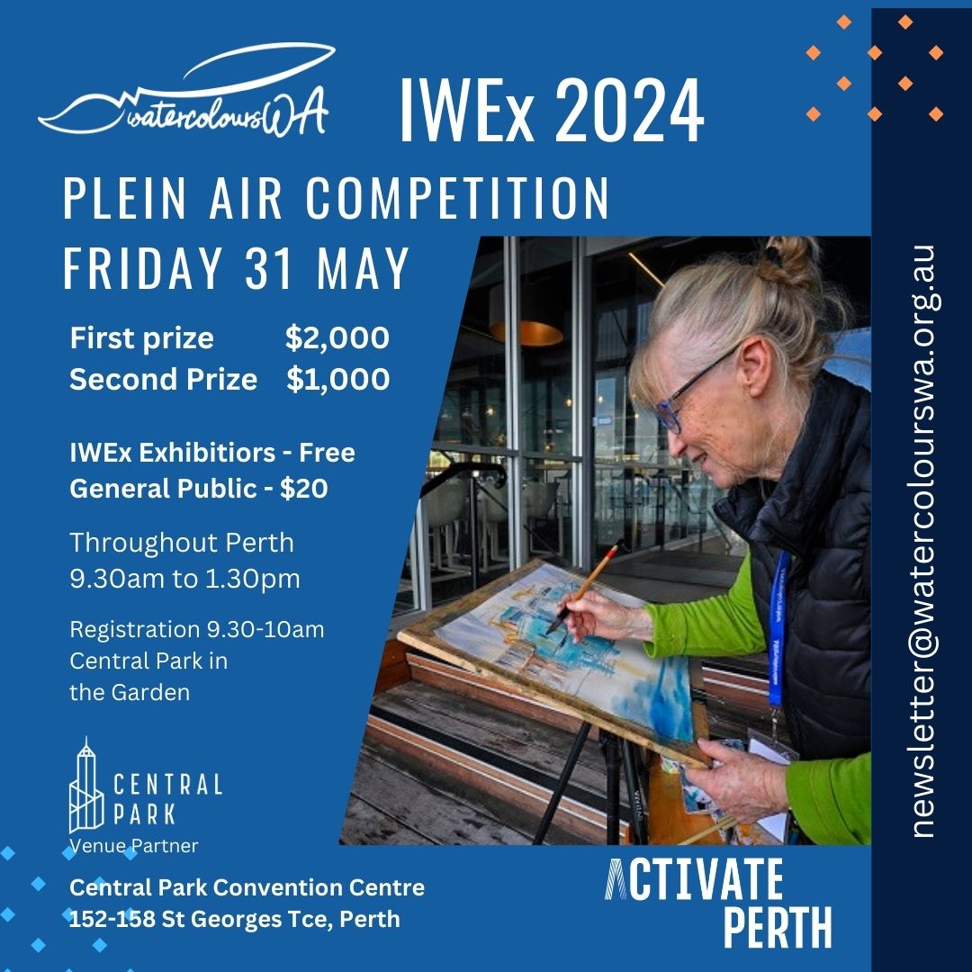 This is not only a competition but an opportunity to be part of a group who will have their artwork mounted, displayed and if you would like, to have it for sale. The paintings will be displayed around the city in a number of shop fronts for three weeks to create an “art trail” that will lead people to another wonderful event. This is a forerunner to the WSWA International Exhibition being held at Central Park from Monday 10th June – Friday 21st June. We invite all watercolour enthusiasts to join us!