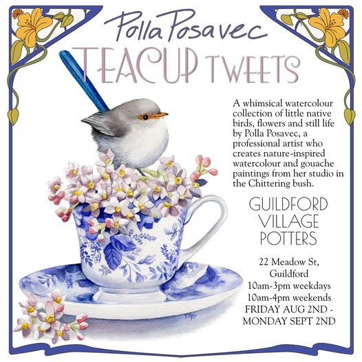 “Teacup Tweets” is my next exhibition, coming very shortly all August at Guildford Village Potters. It’s a collection of sweet and whimsical little watercolours featuring little native birds, flowers and still life.