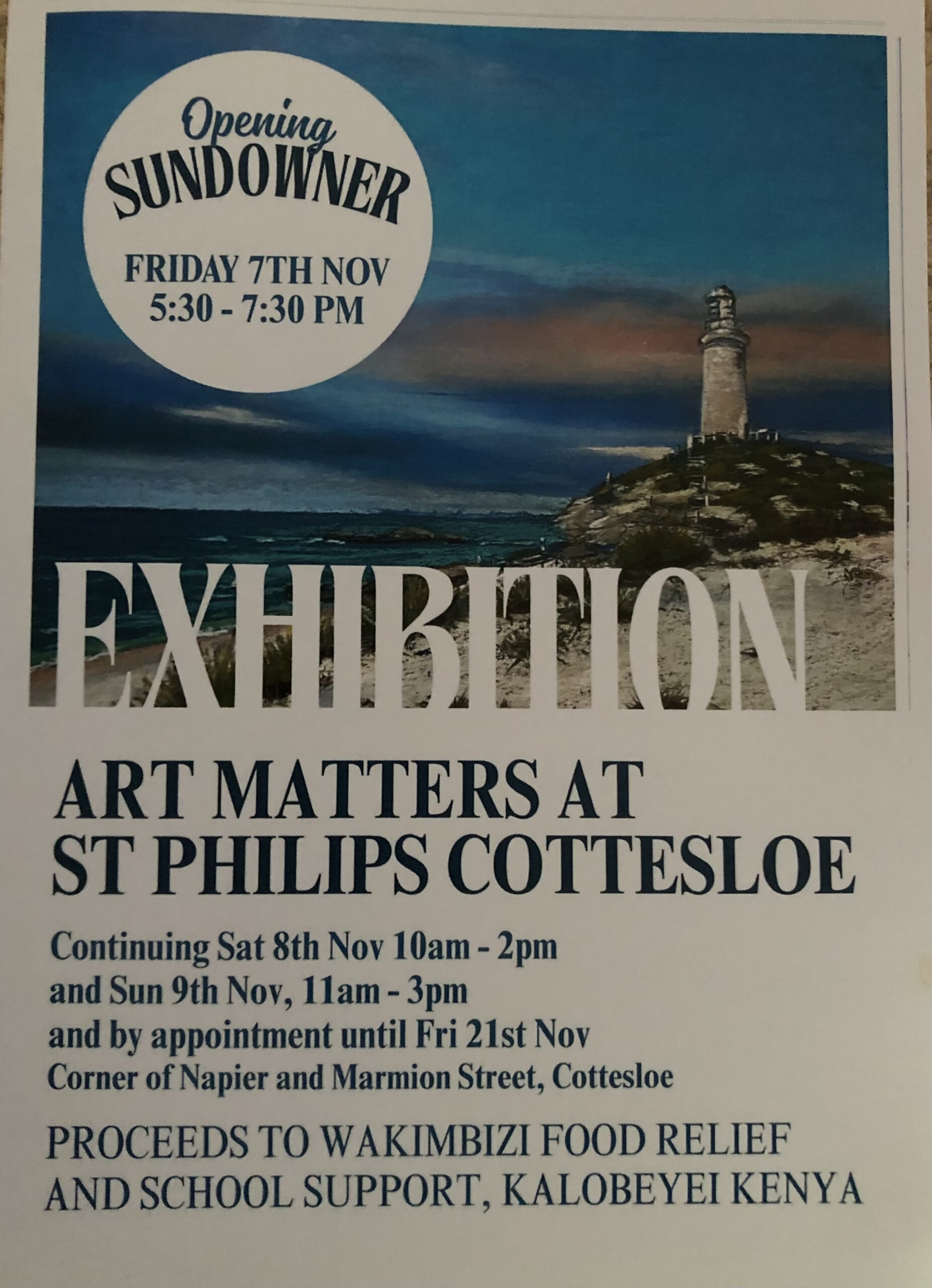 Exhibition at St Philips Cottesloe, proceeds to Wakimbizi Food Relief and School Support, Kenya. Opening Sundowner Friday 7th November and continuing until Friday November 21st.