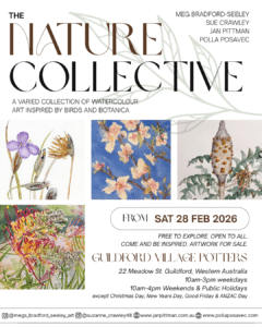 Exhibition of watercolour art art inspired by nature featuring Meg Bradford-Seeley, Sue Crawley, Jan Pittman and Polla Posavec. Open daily at Guildford Village Potters.