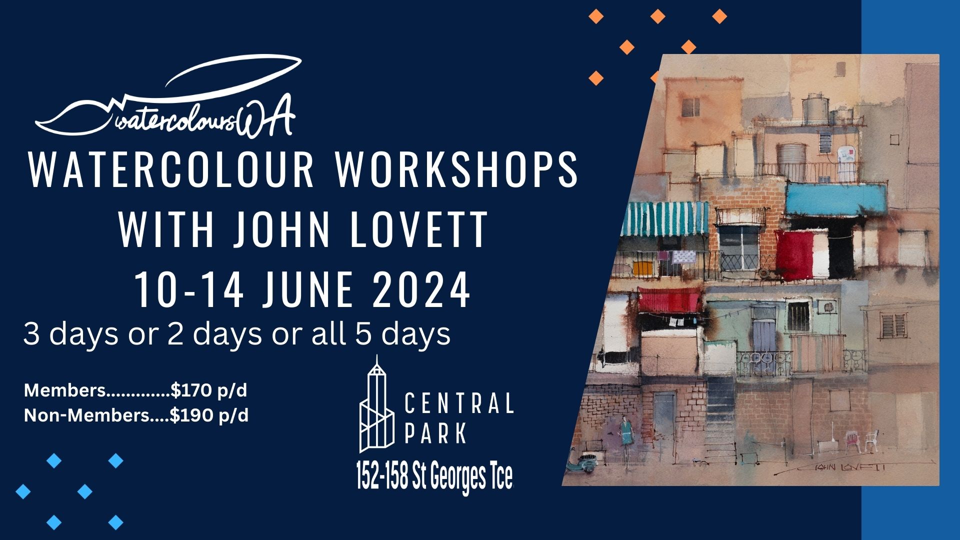 As part of the International Watercolour Exhibition 2024 to be held at Central Park – 152-158 St Georges Terrace, Perth,  WatercoloursWA is pleased to announce our Master Artist for this event is John Lovett.